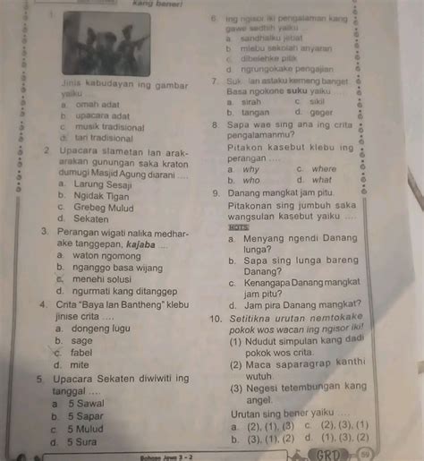11. 6. rereka anggone ngucapake wanda utawa tetembungan sing ana lukke, supaya luwih enak dirungokake, kaya-kaya ana ana titi laras tambahan diarani …. a. cakepan c. titi laras b. luk d. gregel 7. ngenggokake wanda (suku kata) karo notasi tembang utawa titi larase ing tembang macapat diarani …. a. cakepan c. titi laras b. luk d. gregel 8. lho, lha kok ngono? tembung lho, kalebu tuladhane tembung … a. aran c. panguwuh b. kriya d. kahanan 9. wujud ketrampilan kang gegayutan karo ulah kridhane basa lan ulah kridhane pikiran diarani .... a. nulis c. nembang b. ngarang d. crita 10. kang baku sajroning ngarang kudu nggatekake supaya basa kang kanggo medharake gagasan gampang ditampa dening para pamaca. carane yaiku kanthi migunakake ukara-ukara kang .... a. dawa c. akeh b. efektif d. efisien mapel:jawa kelas 7h tolong bantuin susah soal ini susah tolong bantuin ku kasih poin banyak